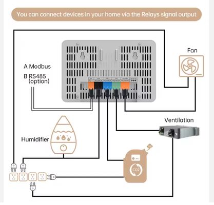 | Pojedyncze okablowanie wyjściowe | RS485/Przekaźniki dla wyjścia sygnału CO2TVOC, PM2.5 i wilgotności |