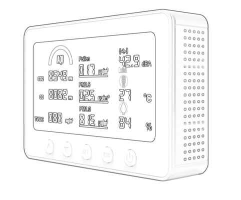 | Przeznaczenie | Wykrywanie i cyfrowe monitorowanie w czasie rzeczywistym: CO2, CO, Pyłki, PM1.0, PM2.5, LZO, Wilgotność, AQI, Hałas |